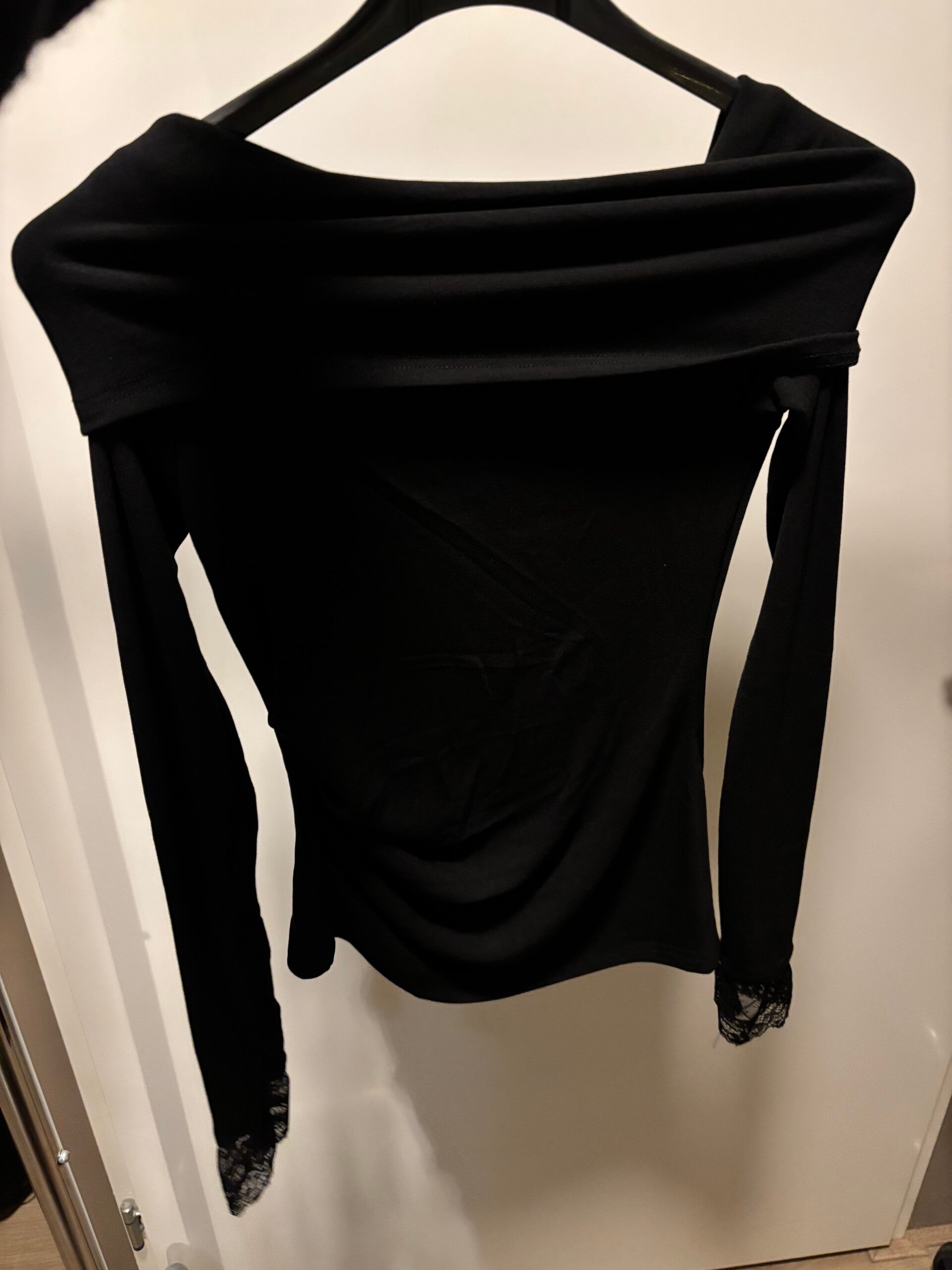 Mooie, stretchy offshoulder top met een kanten mouwtje. De onderkant van de top is asymmetrisch. Te dragen t/m maat 38/40.