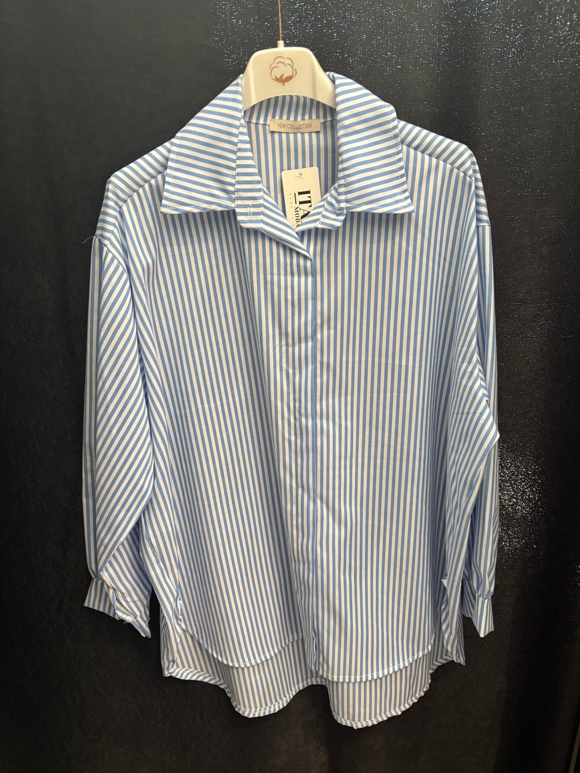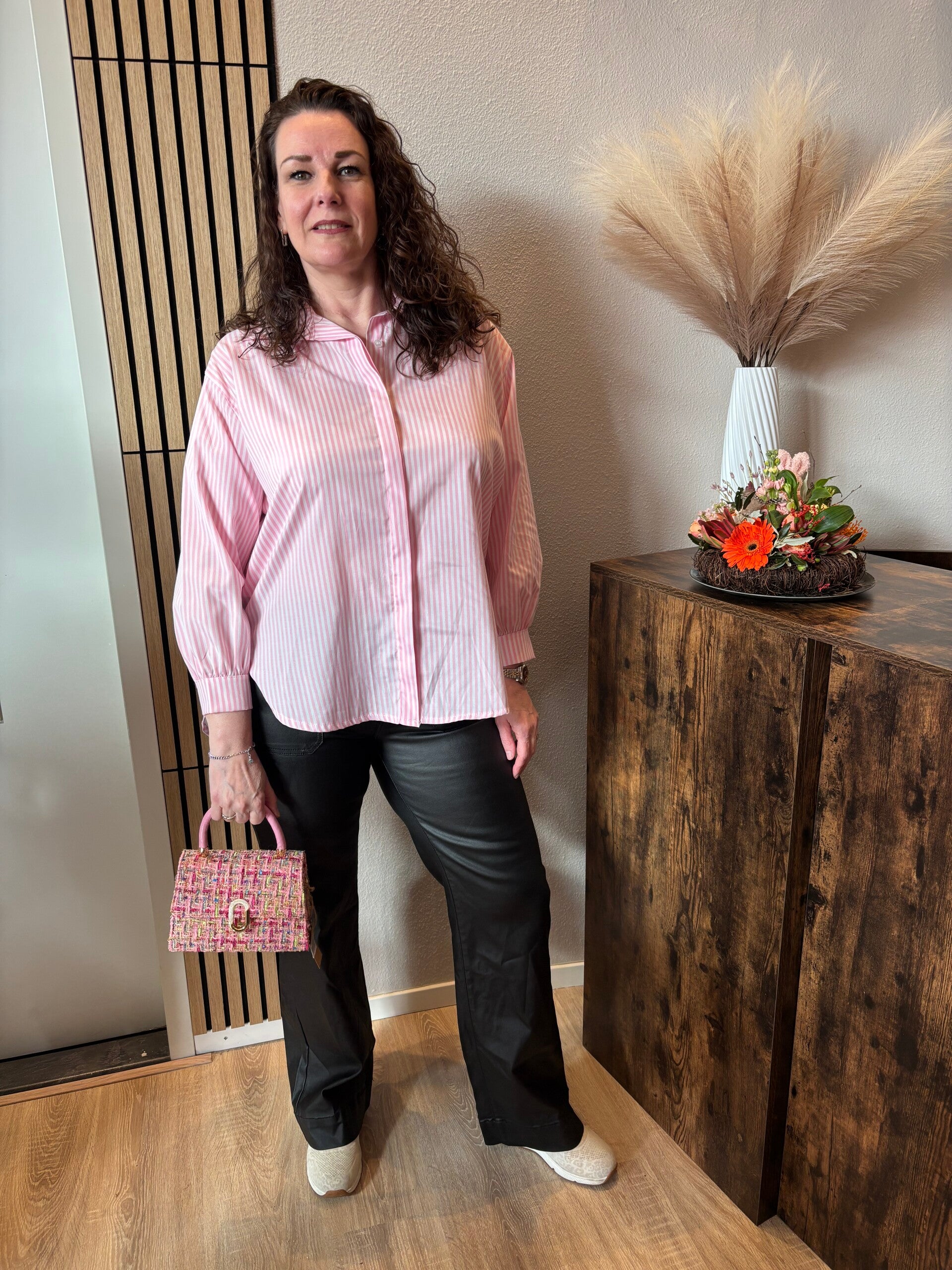 Een mooie blouse in one-size. Te dragen t/m maat 46. Het model valt aan de achterkant wat langer. Het model draagt de blouse op onze leather look broek. Het model op de foto is 1.72m.