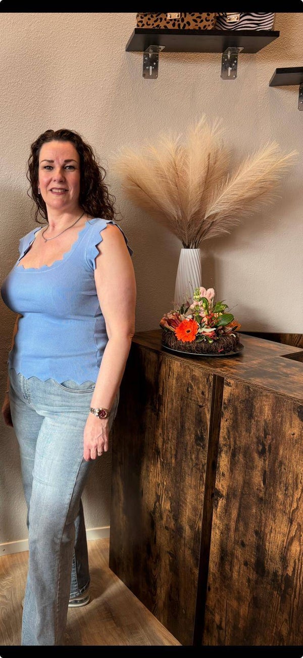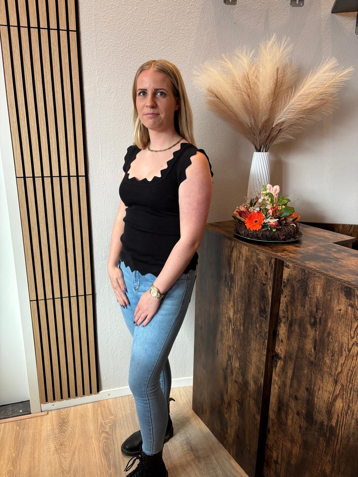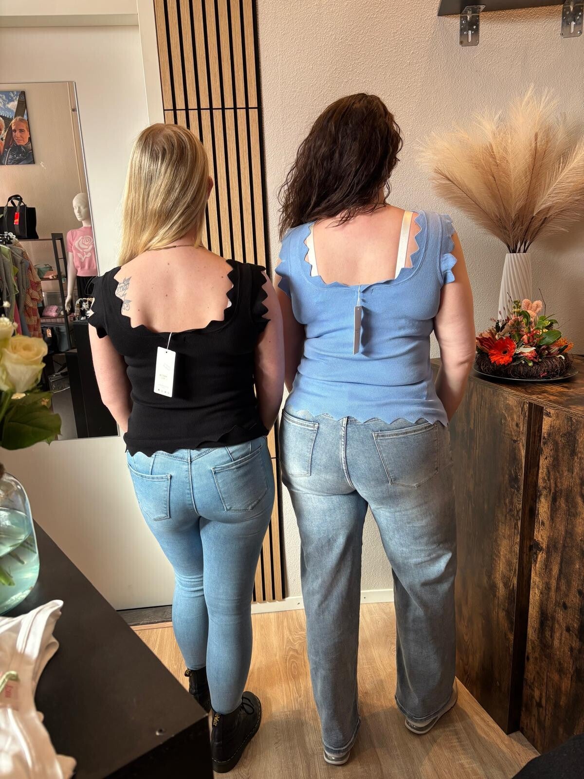 Een mooie stretchy top. De top is verkrijgbaar in 2 maten en in 2 kleuren. De modellen dragen maat S/M in het zwart en blauw in M/L. Het zwarte jasje is onze Button Jacket.