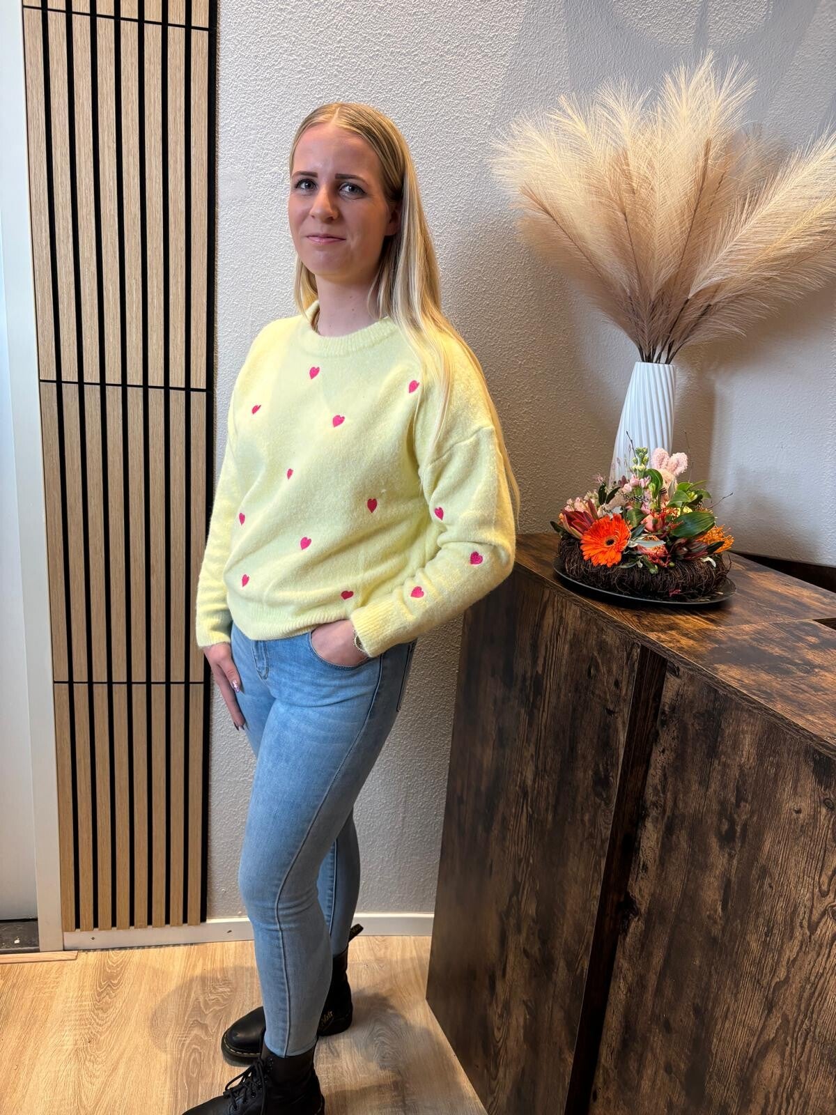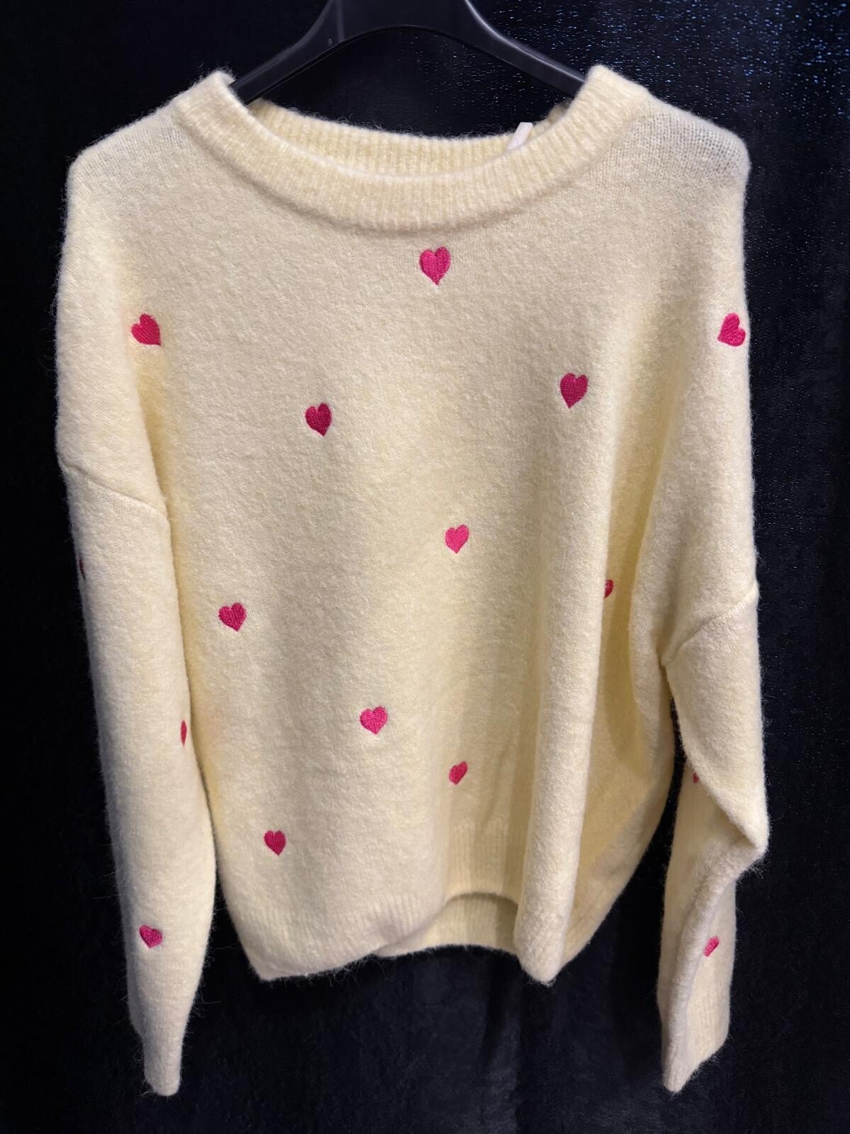 Een heerlijke, zachte licht gele trui met roze hartjes.