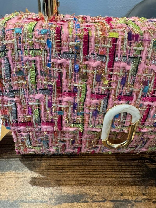 Een mooi tasje met kunstleren handsvat. Er zit een gekleurd geborduurd werkje in met gouden details. Je kan de tas ook eventueel aan je schouder hangen met de bijpassende strap.
