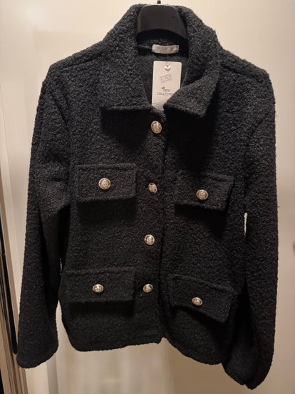 Leuk kort bouclé jasje met gouden knopen. Te dragen t/m maat 44.